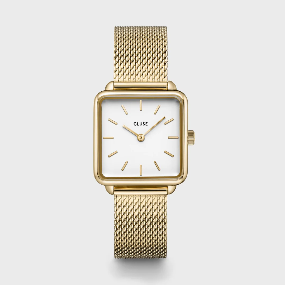 Το τετράγωνο γυναικείο ρολόι La Tétragone διαθέτει θήκη 28.5 mm σε χρυσό χρώμα, λευκό καντράν και λουράκι 16 mm από ανοξείδωτο ατσάλι σε χρυσό χρώμα.Αλλάξτε εύκολα το ύφος του ρολογιού σας με οποιοδήποτε λουράκι CLUSE 16 mm. Μπορείτε να προσαρμόσετε μόνοι σας το λουράκι.